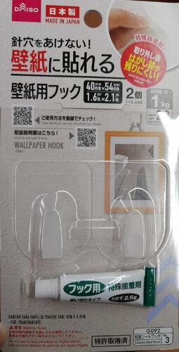 ダイソーで以前から使っている 賃貸にはありがたいアイテム 壁紙に貼れる壁紙用フック。 大きさも何種類かあります。 長年こんなアイテムを探していました。 きれいに剥がれやすいと書かれています。 以前、引っ掛けて剥がれてしまったことがあるんですけど …